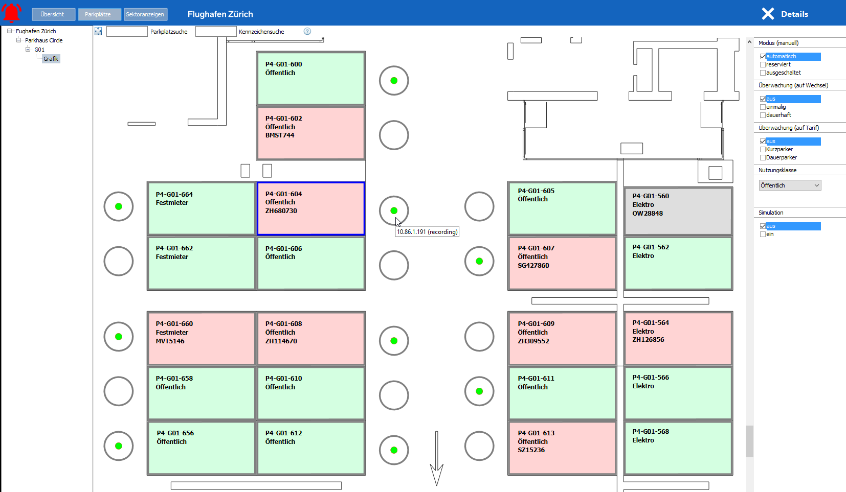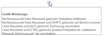 - selektieren von Parkplätzen via Auswahlrechteck oder Einzelselektion und bearbeiten wie in der Listenansicht via Parkplatz Details.