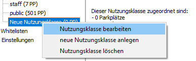 Über das Kontextmenu in der Navigation kann eine neue Nutzungsklasse angelegt, gelöscht oder eine bestehende in den Bearbeitungsmodus gesetzt werden.