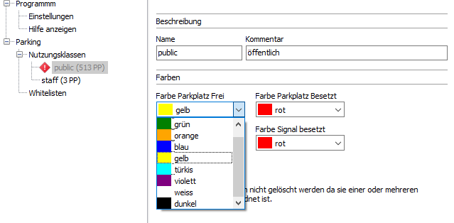 Eine Nutzungsklasse definiert die Anzeigefarbe Frei/Besetzt der Parkplatzanzeige. Falls einer Nutzungsklasse Sektoranzeigen zugeordnet sind kann auch die Frei/Besetzt Farbe dieser Anzeigen definiert werden.