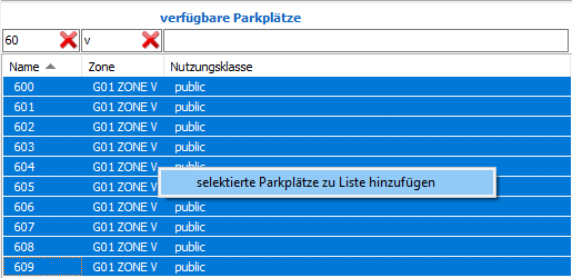 Im Feld "verfügbare Parkplätze" besteht die Möglichkeit Parkplätze zu sortieren und filtern. Selektierte Parkplätze können danach mit dem Kontextmenu der rechten Maustaste zur Liste hinzugefügt werden.