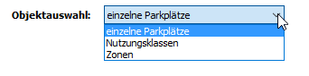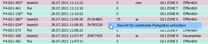 - für die Auswahl einzelner Parkplätze muss auf die Listenansicht gewechselt werden. Dort können die gewünschten Parkplätze selektiert und mit der rechten Maustaste in den Zwischenspeicher für die Anforderung des Berichts kopiert werden. Nach diesem Vorgang kehrt das Programm automatisch auf die Berichtseite zurück.