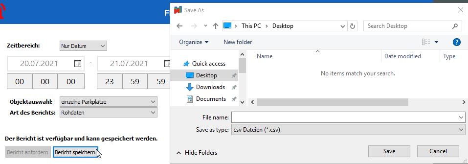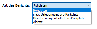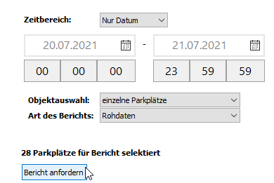 Hier sind Auswertungen welche Parkvorgänge betreffen abrufbar. Die Berichte werden auf dem Server auf Anforderung generiert und via Client als *.csv Datei zum Download angeboten. Folgende Parameter müssen angegeben werden: