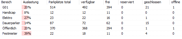 Pro Ebene werden zusätzlich die Gesamtzahlen und Auslastung der einzelnen Nutzungskategorien angezeigt.