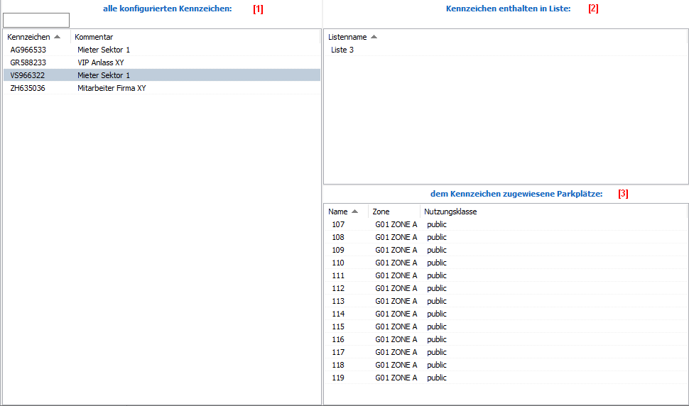 Liste aller Kennzeichen welche in mindestens einer Whiteliste enthalten sind. Wird ein Kennzeichen selektiert werden die Ansichten [2] und [3] aktualisiert. Es kann nach Kennzeichen sortiert und gefiltert werden. |